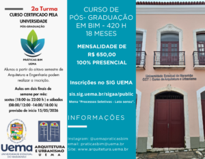 A especialização será oferecida pelo curso de Arquitetura e Urbanismo da Universidade Estadual do Maranhão, para Arquitetos e Urbanistas, Engenheiros, Paisagistas e outros profissionais envolvidos com o ciclo da construção civil. Os participantes estarão aptos a desenvolver, gerenciar e acompanhar projetos em todo o ciclo da construção civil, utilizando softwares na metodologia BIM, desenvolvendo novas habilidades e competências dentro dos processos de projeto, planejamento e compatibilização de obras civis.